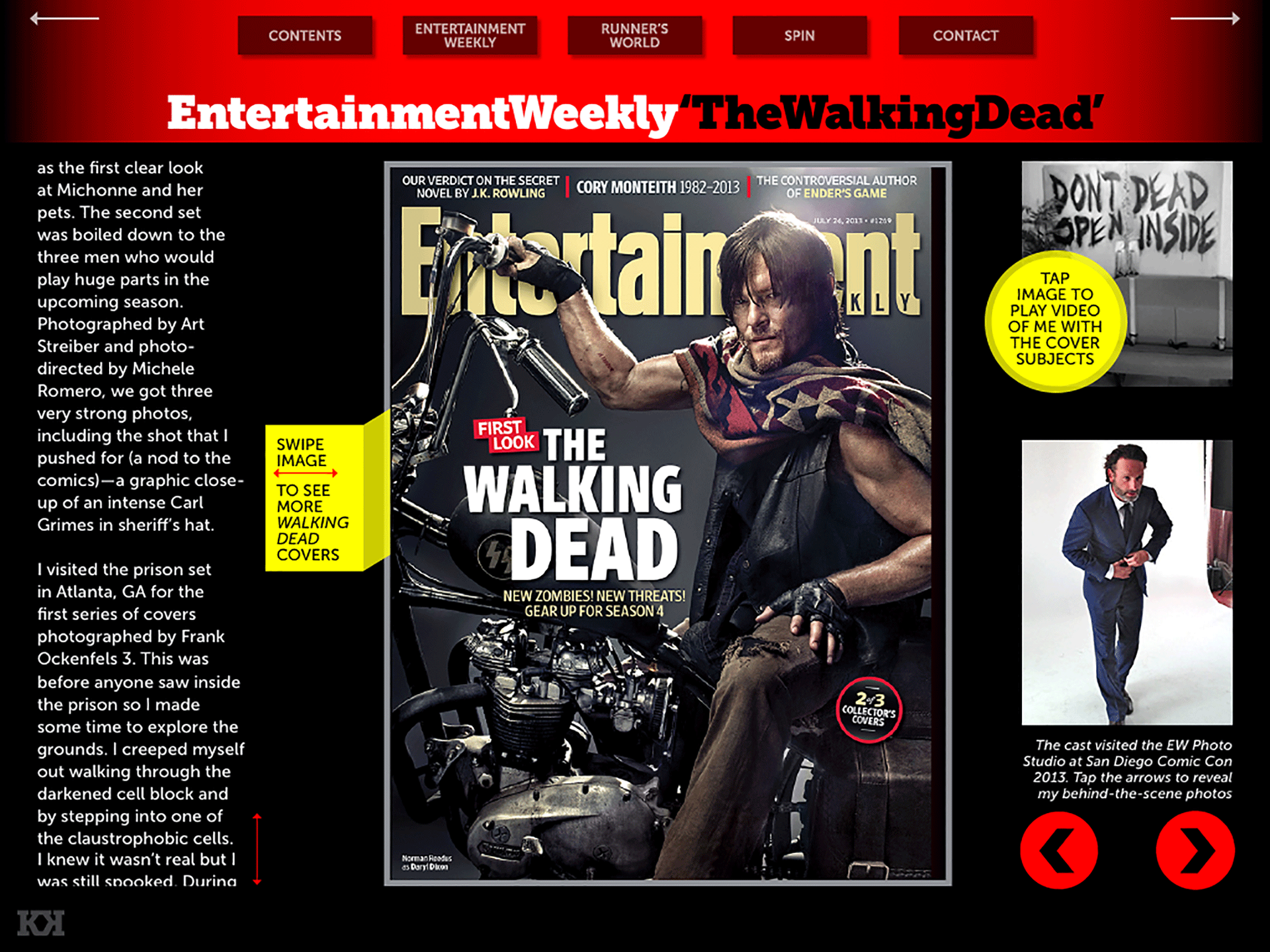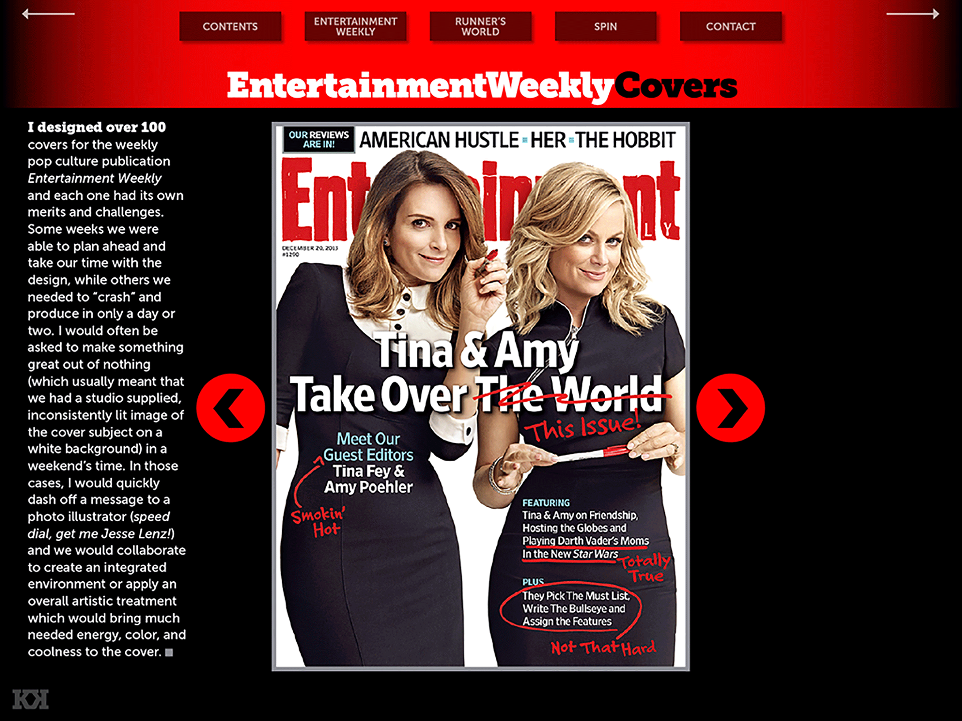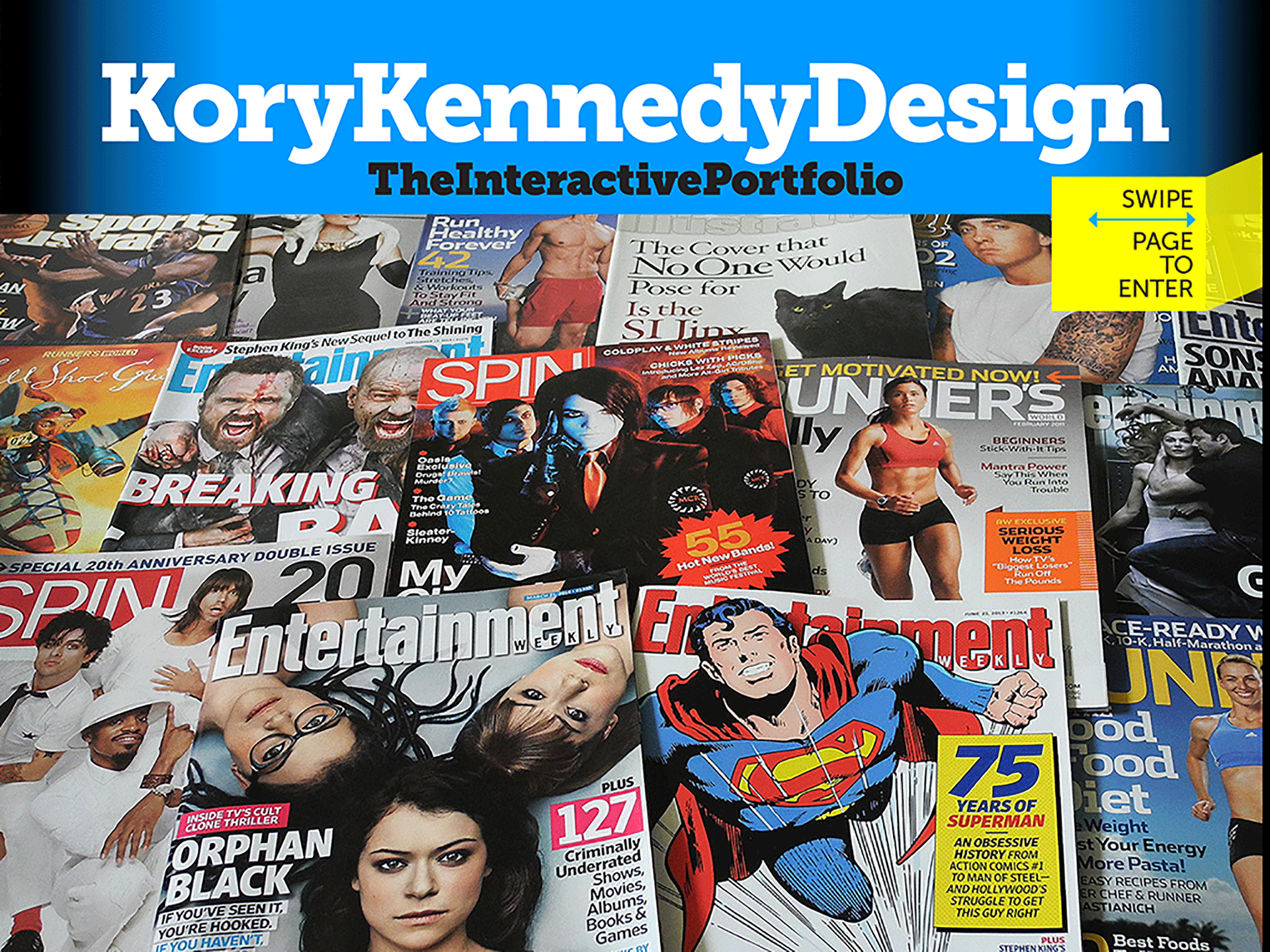 Kory Kennedy Design: The Interactive Portfolio app is a deep, interactive dive spanning the past ten action-packed years of prominent Creative Director and Graphic Design Kory Kennedy's career, in which he created very cool, very award-winning work as Design Director for the beloved and internationally recognized brands Entertainment Weekly, Runner's World, and Spin. Reinvented to show off the merits of his app-building expertise, this bright, bold and fun interactive portfolio is a collection of Kory's best work. Be inspired by the diverse design and thoughtful typographical choices in his layouts, while sneaking a peek behind the curtain of his process as he shares anecdotes about the creation of certain pieces. He also unveils some of his personal behind-the-scenes photos from the sets of big-time photo shoots. View with sound on ;) Designed, written, and published by Kory Kennedy