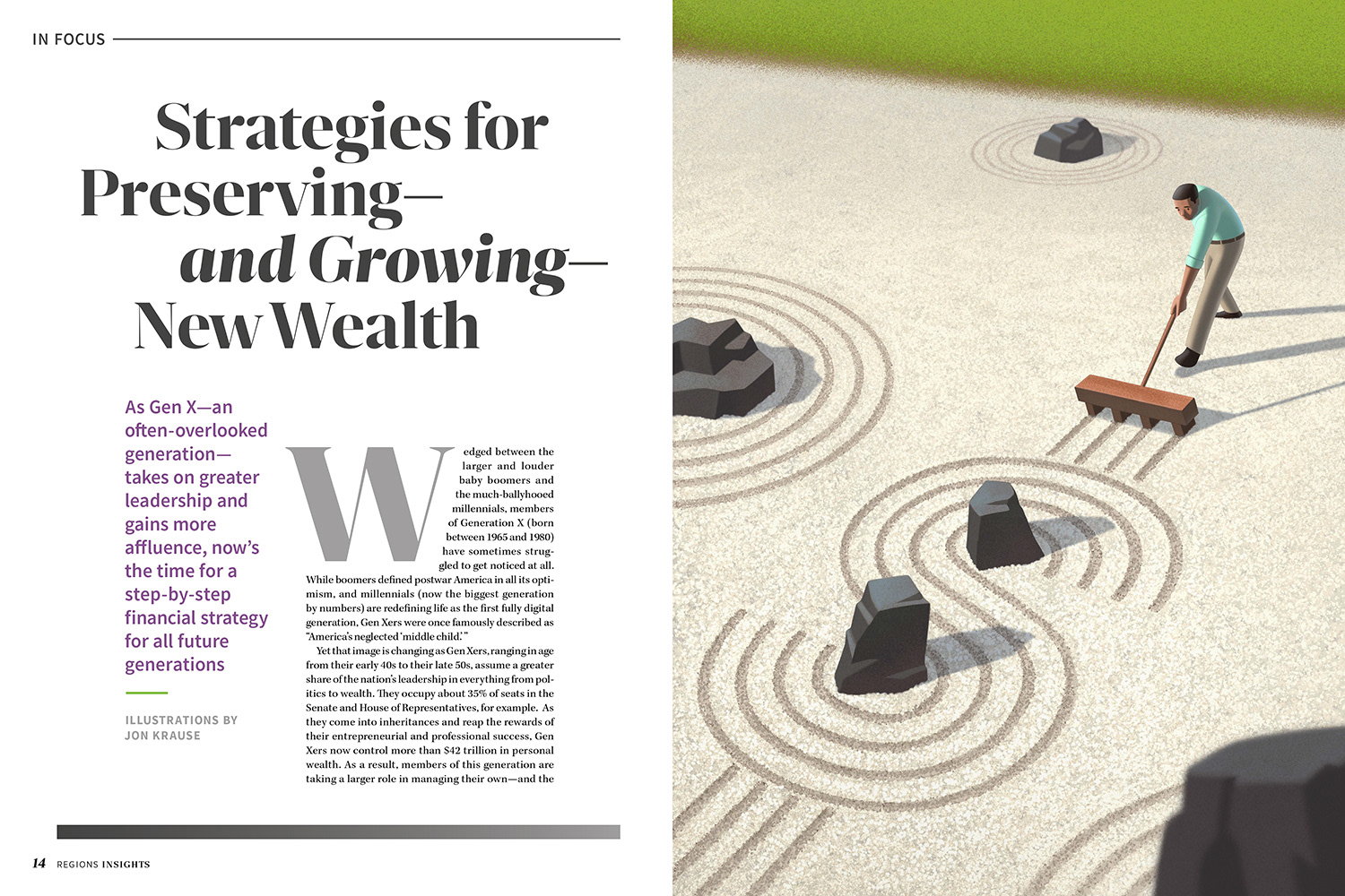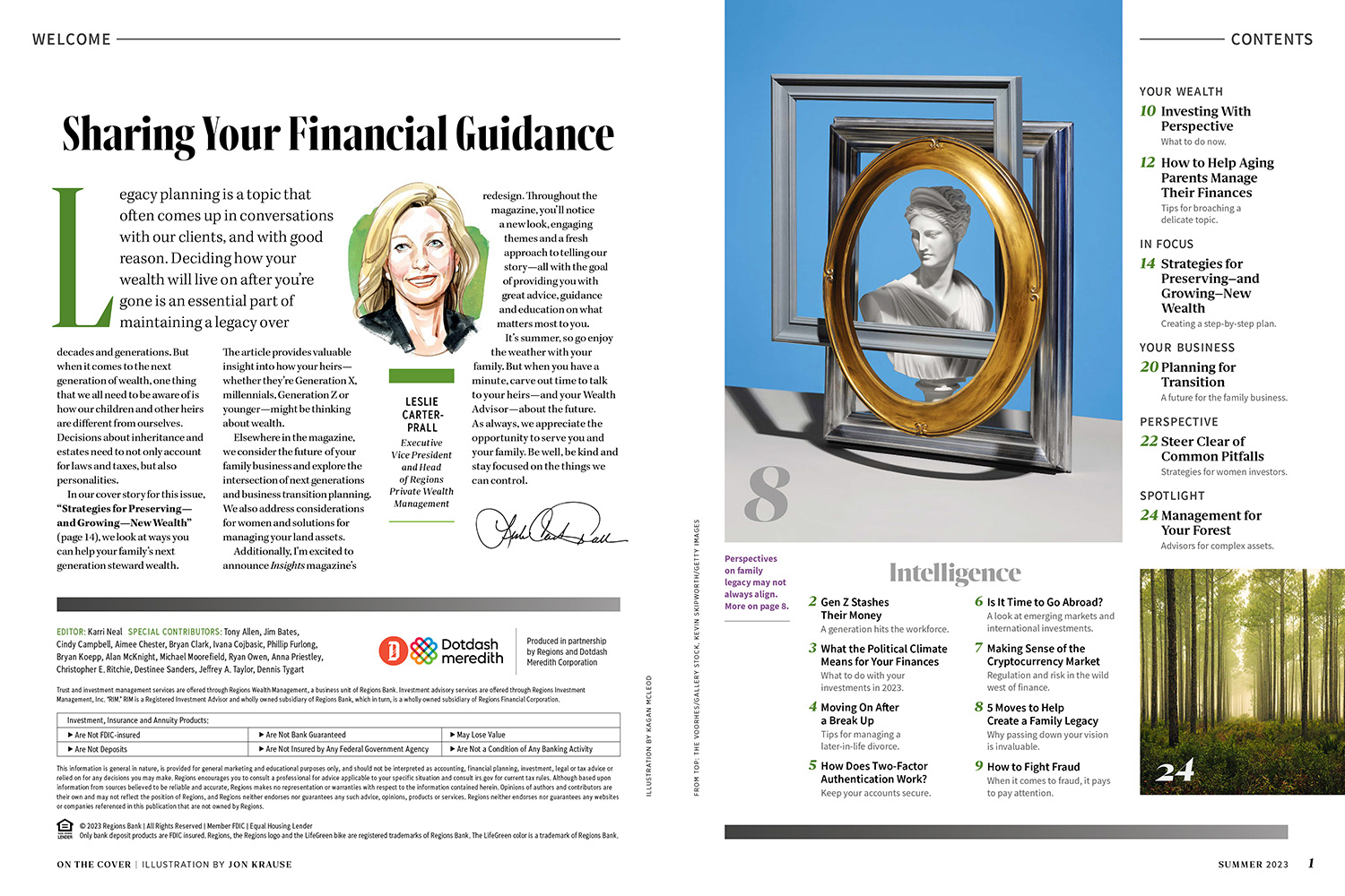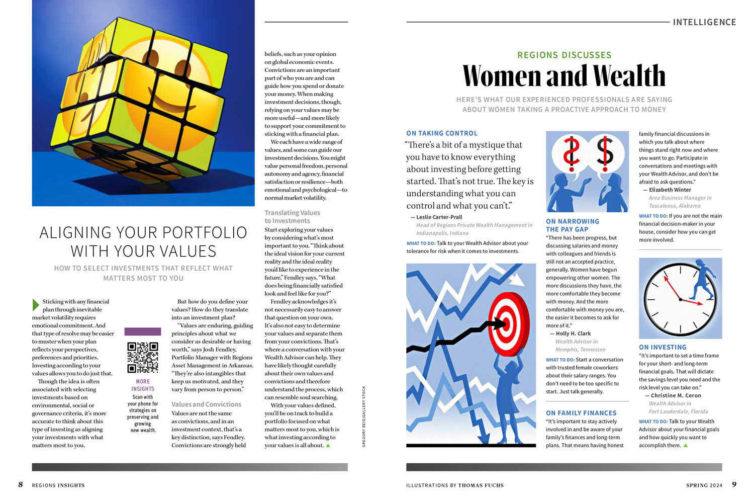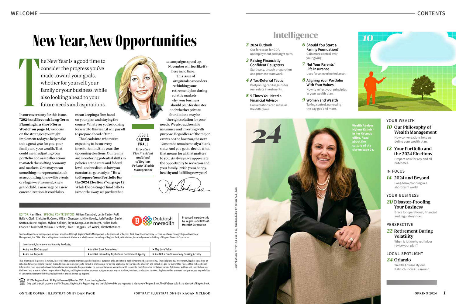 Redesign Cover and Spreads for Regions Insights Magazine (Private Wealth Management) Creative Director: Kory Kennedy Associate Art Director: Nicole Cioe Executive Creative Director: Jennifer Tuozzolo Photo Editors: Geoff Chadsey, Karissa Maggio