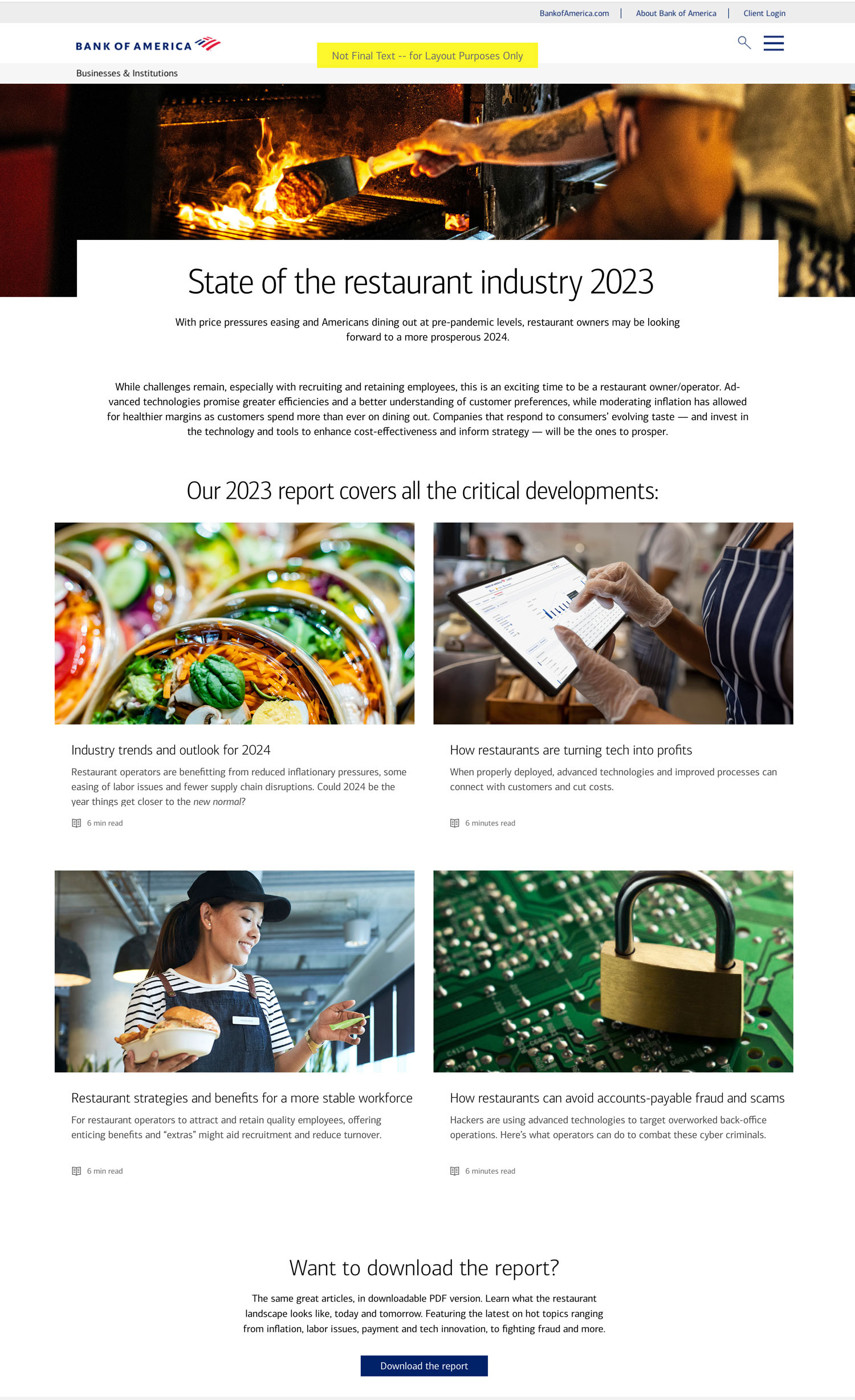 Website and Whitepaper Design for Bank of America (Ozzies Honorable Mention Winner for B2B Analysis Category) Creative Director: Kory Kennedy Assistant Art Director: Chris Aruba Photo Editor: Geoff Chadsey